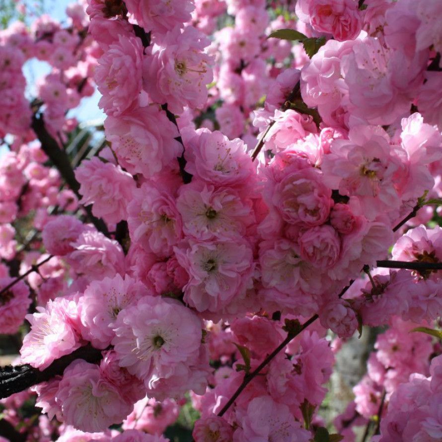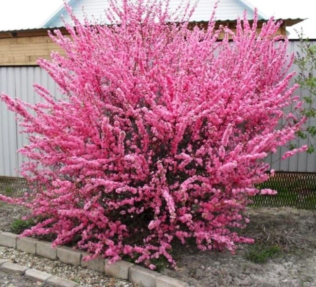 Цветки диаметром 3,5 см, чашевидные, махровые, тёмно-розовые, расположены по всей длине прошлогодних побегов.