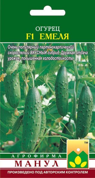 Огурец F1 Емеля - скороспелый урожайный партенокарпический гибрид женского или преимущественно женского типа цветения для весенних теплиц, тоннелей, открытого грунта. Растения сильнорослые, с укороченными междоузлиями; ветвление среднее или ниже среднего. Зеленцы интенсивно-зеленого цвета, крупнобугорчатые белошипые, овально-цилиндрической формы, длиной 13-15 см, очень высоких вкусовых качеств, хороши для засолки и консервирования. Для гибрида характерны дружная отдача урожая и повышенная холодостойкость. Урожайность F1 Емеля, несмотря на более короткие зеленцы, держится на уровне гибридов Зозуля и Апрельский, а в годы с ненастным летом превосходит их. Гибрид устойчив к оливковой пятнистости, вирусу обыкновенной огуречной мозаики, толерантен к корневым гнилям и мучнистой росе. Плотность посадки в теплицах 2,5 раст./м2, в открытом грунте 3-4 раст./м2.