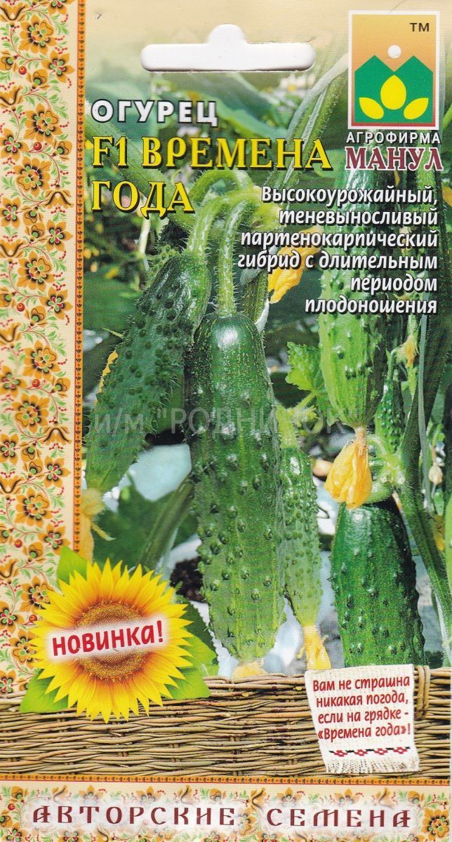 Огурец F1 Времена года - скороспелый теневыносливый партенокарпический гибрид салатного назначения для весенне-летнего и летне-осеннего оборотов. Растения сильнорослые, женского типа цветения, ветвление сильное. В узлах формируется от 1-2 до 3-4 завязей. Партенокарпия высокая. Зеленцы бугорчатые, белошипые, вкусные, длиной 14-16 см, без шейки, массой 120-150 г. Бугорки крупные, частота расположения бугорков средняя. Поверхность зеленцов ярко-зеленой окраски с короткими светлыми продольными полосами. Мякоть сочная, плотная, ароматная, кожица негрубая, но плотная. Зеленцы также хорошо маринуются и засаливаются. Гибрид устойчив к мучнистой росе, оливковой пятнистости, вирусу обыкновенной огуречной мозаики, толерантен к ложной мучнистой росе. Предназначен для выращивания в теплицах и открытом грунте на шпалере. Повышенная теневыносливость позволяет возделывать его на затененных участках ("огурец под яблоней"). Плотность посадки в теплицах 2,5 раст./м2, в открытом грунте 4-5 раст./м2.