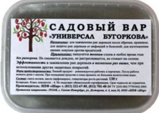 Садовый вар «Универсал Бугоркова» способствует скорейшему заживления ран плодовых деревьев и кустарников при обрезках и прививках черенков. Вар изготовлен на основе воска, в его состав также входят парфюмерное масло и стимуляторы роста. Он представляет собой прозрачную пасту, которая наносится тонким слоем на поврежденные места. Она прекрасно обеззараживает участки коры и способствует скорейшему образованию каллюса. Активные вещества содержатся в варе в высоких концентрациях, поэтому на поврежденный участок он наносится тонким слоем. При этом образуется тонкий светопроницаемый слой, который обладает высокой эластичностью и морозостойкостью. Он не смывается от дождя и не растрескивается на солнце. Паста применяется в любое время года без разогрева. Садовый вар «Универсал Бугоркова» применяется при обрезках деревьев для скорейшего заживления образующихся срезов, для заживления ран при проведении прививок, для защиты поврежденных участков деревьев от инфекций. Помимо своего прямого назначения, также используется для изготовления липких ловушек для вредителей. Проведенные в различных садоводческих хозяйствах исследования показали, что эффективность использования садового вара «Универсал Бугоркова» в качестве ранозаживляющего средства для плодовых деревьев значительно выше, чем у других защитных средств.